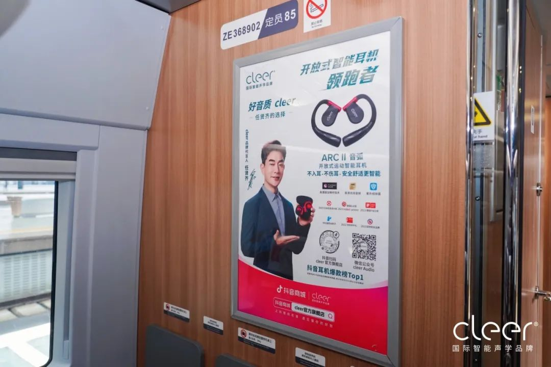 走進(jìn)Cleer耳機高鐵專(zhuān)列,旅客可以看到專(zhuān)為品牌構建起的全方位立體化傳播空間。外車(chē)身貼,是穿梭在全國各地高鐵站中最靚麗的品牌風(fēng)景線(xiàn);頭枕巾、小桌板、品牌長(cháng)廊、列車(chē)海報,重復性視線(xiàn)吸引,不斷深化品牌形象。加上高鐵乘客的巨大流動(dòng)性,勢必會(huì )為高鐵車(chē)廂內的Cleer品牌宣傳帶來(lái)更廣闊的影響力。