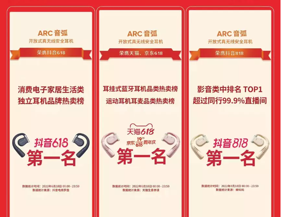在眾多開(kāi)放式耳機品牌中,以國際智能聲學(xué)品牌Cleer最為突出。其在2021年12月推出的Cleer ARC系列一代產(chǎn)品是國內首批推出的開(kāi)放式真無(wú)線(xiàn)耳機,一經(jīng)上市便以“不入耳、不傷耳 安全更舒適”的差異化賣(mài)點(diǎn)迅速席卷市場(chǎng),在市場(chǎng)上掀起了一股開(kāi)放式真無(wú)線(xiàn)耳機的聽(tīng)音新“響”法熱潮。值得一提的是,它還打破了當時(shí)無(wú)線(xiàn)智能耳機市場(chǎng)跟風(fēng)AirPods的局面,一舉成為2022年度“爆款”電子產(chǎn)品,在抖音618、818、雙11等重磅電商活動(dòng)中均穩居各大榜單銷(xiāo)售榜首,更為耳機行業(yè)開(kāi)辟了一條新的開(kāi)放式耳機賽道。